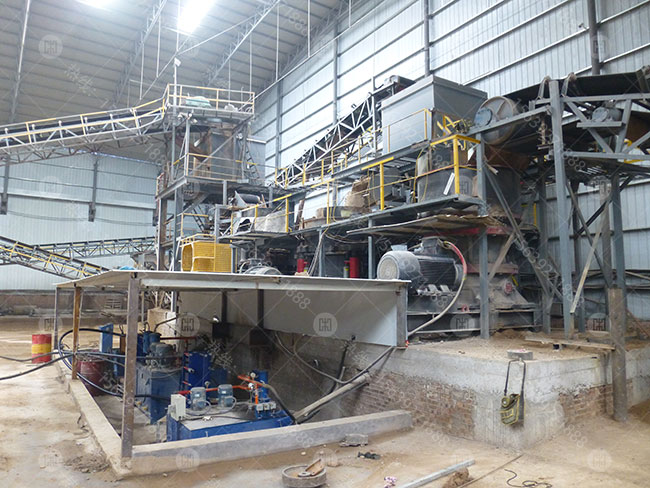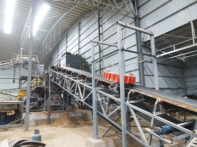 該制砂生產(chǎn)線原料為河卵石,設(shè)計時產(chǎn)量200噸,原料河卵石由運(yùn)輸車從河道運(yùn)到料廠,然后通過料倉均勻送到PE750*1060顎式破碎機(jī),進(jìn)行粗破,粗破后的物料進(jìn)入單缸440圓錐破碎機(jī),圓錐破出來的料送到振動篩,振動篩上料再回到HP300多缸圓錐破碎機(jī)進(jìn)行制砂,從多缸圓錐破碎機(jī)出來的料,再次進(jìn)入振動篩內(nèi)篩分,篩分出滿足要求的砂子,進(jìn)入洗砂機(jī)進(jìn)行清洗,清洗后由成品輸送機(jī)輸送出既成品。本制砂生產(chǎn)線形成2段閉路循環(huán),采用單缸圓錐破碎機(jī)和多缸圓錐破碎機(jī)配置,出砂率高、易損件少,深受用戶好評!