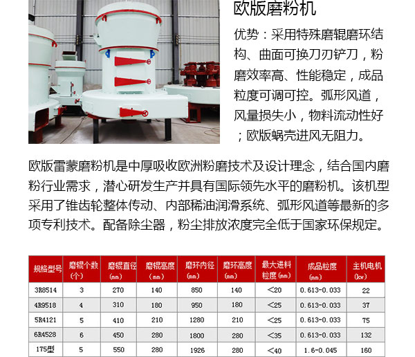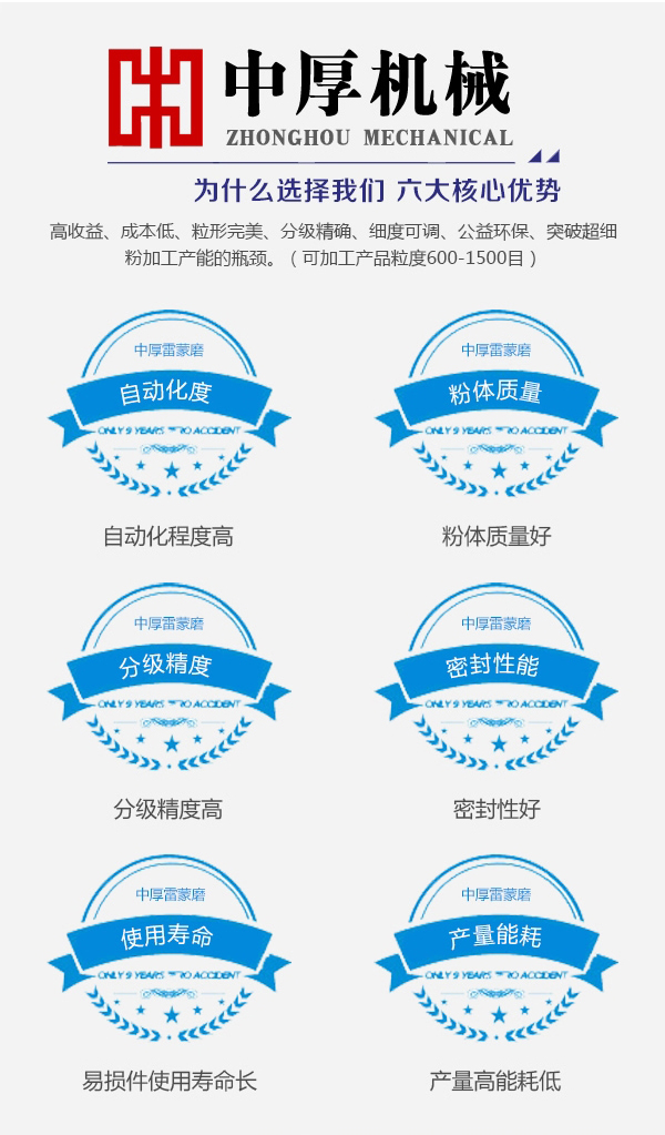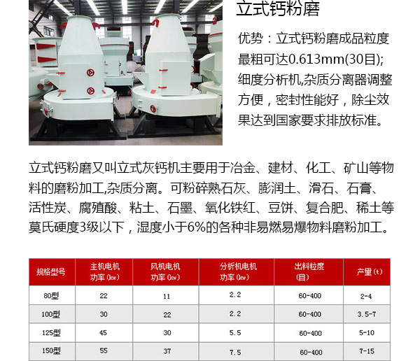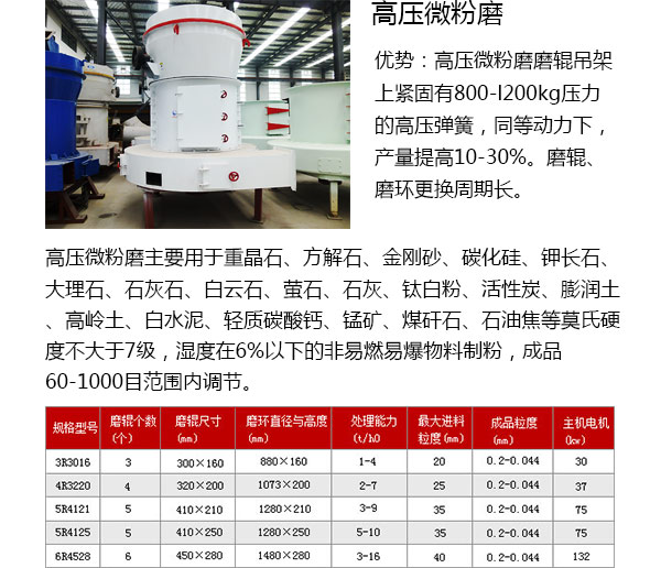 產(chǎn)品介紹:主要用于重晶石、方解石、金剛砂、碳化硅、鉀長(zhǎng)石、大理石、石灰石、白云石、螢石、石灰、鈦白粉、活性炭、膨潤(rùn)土、高嶺土、白水泥、輕質(zhì)碳酸鈣、錳礦、煤矸石、石油焦等莫氏硬度不大于7級(jí),濕度在6%以下的非易燃易爆物料制粉,成品60-1000目范圍內(nèi)調(diào)節(jié)。